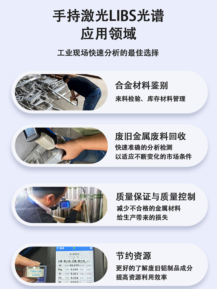 手持式激光誘導擊穿光譜儀利用激光誘導擊穿技術,通過激光在樣品表面產生的等離子體,分析樣品中元素的含量。相比傳統的檢測方法,手持式激光誘導擊穿光譜儀具有檢測速度快、準確性高、操作簡便等優點。使用者只需將儀器對準待檢測的輕質合金樣品,即可在幾秒鐘內獲取到樣品的成分信息,極大地提高了檢測效率。