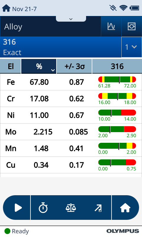 4. 結果:能譜經軟件處理后顯示為樣件的元素組成。在檢測金屬時,我們將測得的元素成分與某個特定的牌號相匹配。
