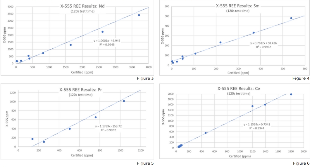 X-555具有特殊的屏蔽能力和3mm直徑的光束準(zhǔn)直性,可直接用于巖石表面和巖芯。它還可以配備一個(gè)聯(lián)鎖試驗(yàn)臺(tái),用于袋裝或袋裝樣品的安全分析。在下圖3-6中,X-555對(duì)各種認(rèn)證參考材料的研究結(jié)果顯示,它們與認(rèn)證值有很好的相關(guān)性。