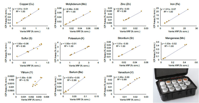 CODES團隊展示了他們對使用傳統(tǒng)ICP-MS/ICP-ES(電感耦合等離子體質(zhì)譜法和發(fā)射光譜法)和手持式XRF分析儀檢測來自六個礦區(qū)的樣品所獲得結(jié)果進行比較的情況:(1)美國Yerington斑巖銅礦區(qū)(±鉬-金);(2)美國Resolution斑巖銅-鉬礦床;(3)秘魯Las Bambas銅-鐵矽卡巖礦區(qū);(4)澳大利亞Cadia銅-金礦區(qū);(5)澳大利亞Northparkes銅-金礦區(qū);(6)澳大利亞Cowal銅-金礦區(qū)。