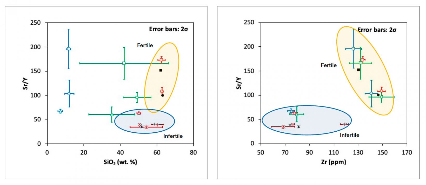 (a) Sr/Y對比SiO2的判別圖表,通常用作可開采潛力指示。