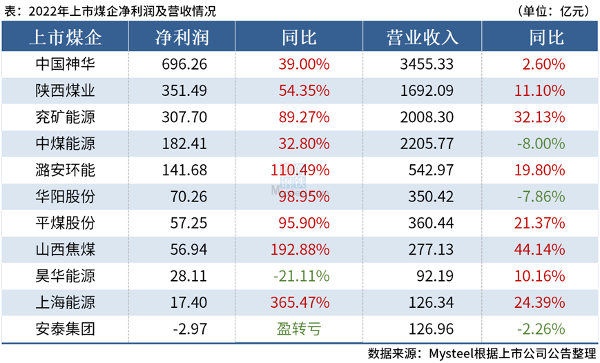 在此之前,陜西煤業(yè)2022年實現(xiàn)營業(yè)收入1692.09億元,凈利潤351.49億元;我國煤炭龍頭中國神華2022年營收達到3445.33億元,實現(xiàn)凈利潤696.26億元,日賺近2億元。