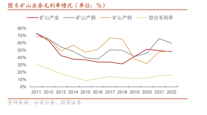 2022年,紫金礦業(yè)全年實現(xiàn)營業(yè)收入達2703億元,凈利潤達200.42億元,其中礦山產(chǎn)金毛利率47.97%,礦山產(chǎn)銅毛利率59.53%,礦山產(chǎn)鋅毛利率48.69%。