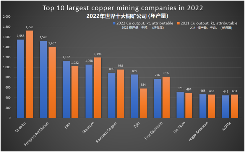 從2022年銅礦產(chǎn)量增加的礦企中,可以看出,自由港-麥克莫蘭公司(Freeport-McMoRan)在印尼的Grasberg礦山,必和必拓在澳大利亞的Olympic Dam礦山,紫金礦業(yè)在剛果(金)的Kamoa銅礦,塞爾維亞Timok銅金礦以及中國西藏巨龍銅礦......這些非南美地區(qū)的銅項(xiàng)目,成為了市場(chǎng)增量的重要組成。