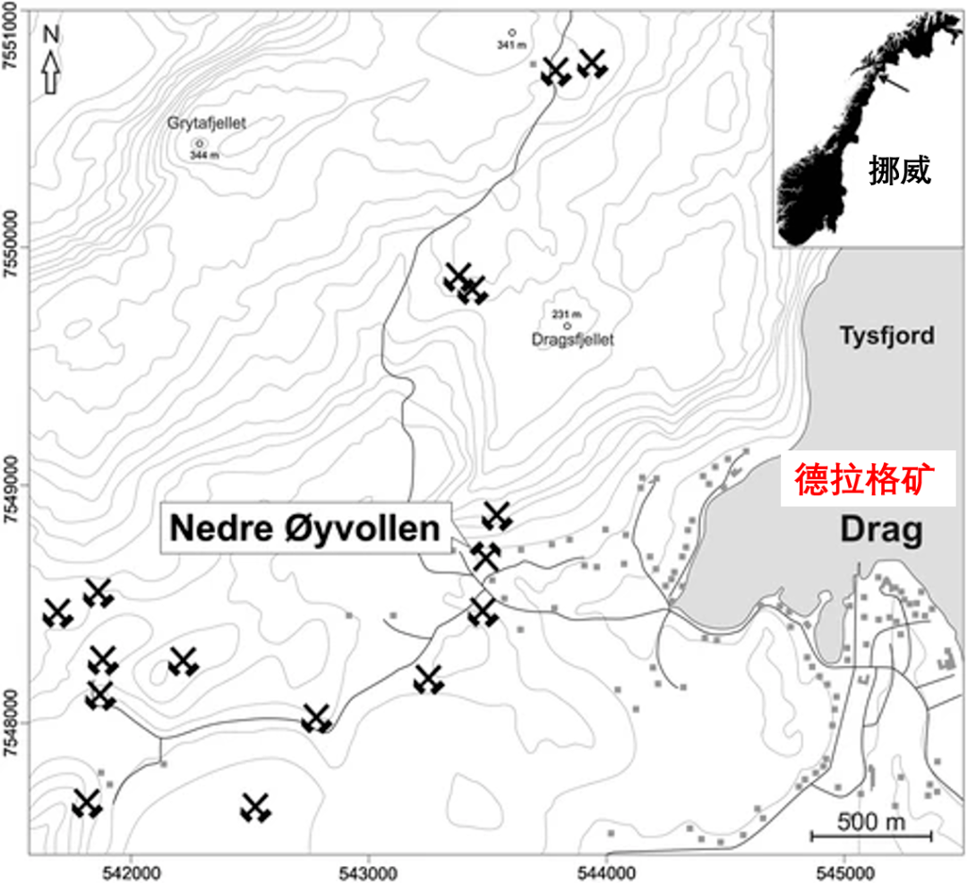德拉格礦區(qū)地處挪威北部諾爾蘭郡廷斯菲尤爾峽灣(Tysfjord)西側(cè)的德拉格村(Drag)附近,由分布在方圓5km2的數(shù)十個(gè)偉晶巖型的石英礦體組成。石英晶體純凈,粒徑平均6mm,Al、Ti、Li、B等晶格雜質(zhì)元素均達(dá)到高純石英原料的質(zhì)量要求(Müller et al,2012)。