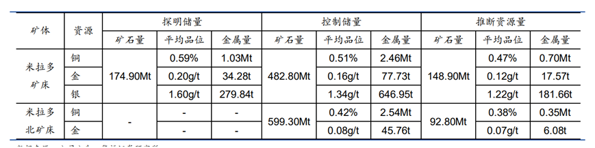 米拉多銅礦床一期于2021年達產,銅礦石的處理能力為 2000萬噸/年,每年產出約9萬噸銅金屬量對應的銅精礦,二期設計擴大到 2,640萬噸/年;米拉多北銅礦床二期設計采選能力 1980萬噸/年。米拉多銅礦整體二期項目預計于2025年6月建成投產,擴建后總采選規模將達4620萬噸/年,預計每年產銅超20萬噸。