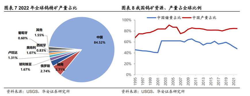 同時(shí),中國也是世界上鎢產(chǎn)量最豐富的國家。根據(jù)美國地調(diào)局(USGS)統(tǒng)計(jì),2022年全球鎢礦產(chǎn)量8.4萬噸,其中中國產(chǎn)量7.1萬噸,約占全球總產(chǎn)量的84.5%。