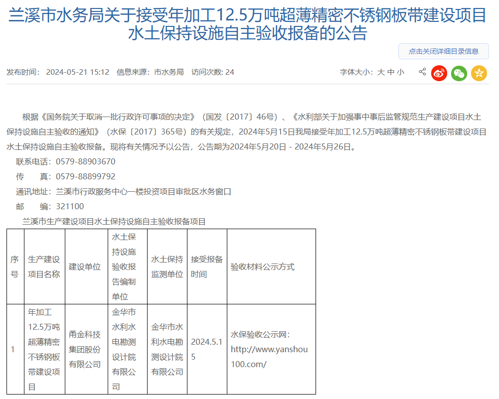 5月21日,蘭溪市水務(wù)局接受浙江甬金科技集團(tuán)股份有限公司年加工12.5萬(wàn)噸超薄精密不銹鋼板帶建設(shè)項(xiàng)目水土保持設(shè)施自主驗(yàn)收?qǐng)?bào)備并對(duì)外進(jìn)行公告,公告期:2024年5月20日-2024年5月26日。