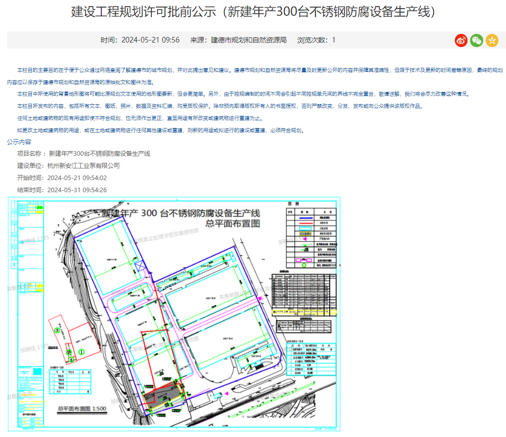建德市人民政府消息,5月21日,建德市規(guī)劃和自然資源局就杭州新安江工業(yè)泵有限公司新建年產(chǎn)300臺(tái)不銹鋼防腐設(shè)備生產(chǎn)線建設(shè)工程規(guī)劃許可進(jìn)行批前公示,公示期:5月21-31日。