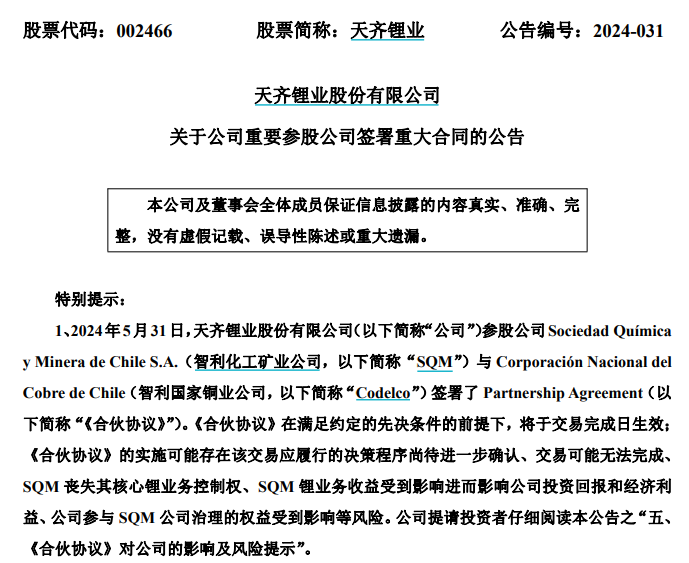 無獨有偶。前段時間,另一礦企天齊鋰業也遭遇了相似的海外資產權屬的問題。作為SQM(智利化工礦業公司)的第二大股東,天齊鋰業在不知情的情況下,SQM與Codelco將組建由政府控制的合營公司,共同開發鋰礦資源。