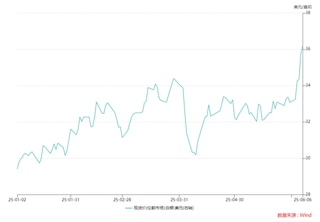 今年以來,在全球經(jīng)濟和政治不確定性日益加劇的背景下,包括白銀在內(nèi)的貴金屬價格受到避險資金的支撐。從年初至今,現(xiàn)貨白銀已累計漲逾23%。6月6日,現(xiàn)貨白銀價格最高報每盎司36.19美元,站上自2012年以來的新高。