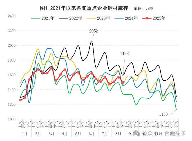 中鋼協發布2025年8月下旬重點企業鋼材庫存旬報,2025年8月下旬,重點統計鋼鐵企業鋼材庫存量1498萬噸,環比上一旬減少69萬噸,下降4.4%;比年初增加261萬噸,增長21.1%;比上月同旬增加20萬噸,增長1.4%;比去年同旬增加44萬噸,增長3.0%,比前年同旬增加26萬噸,增長1.8%。